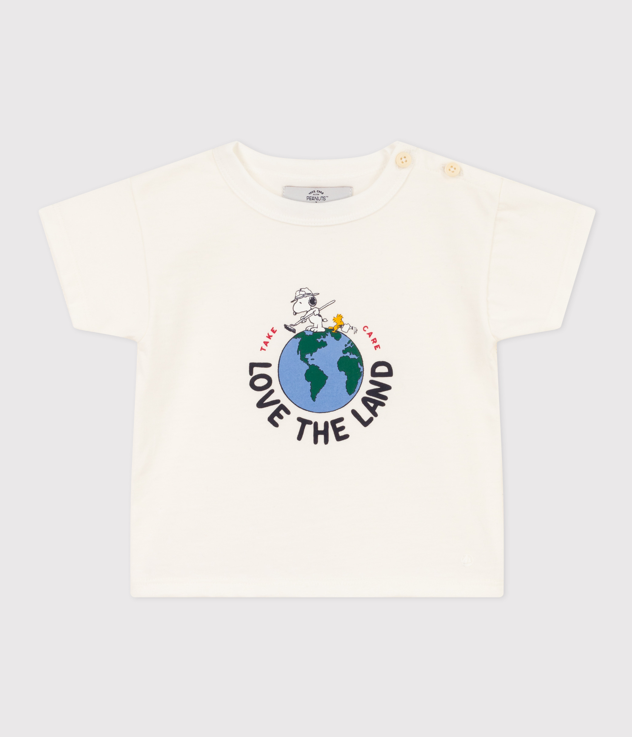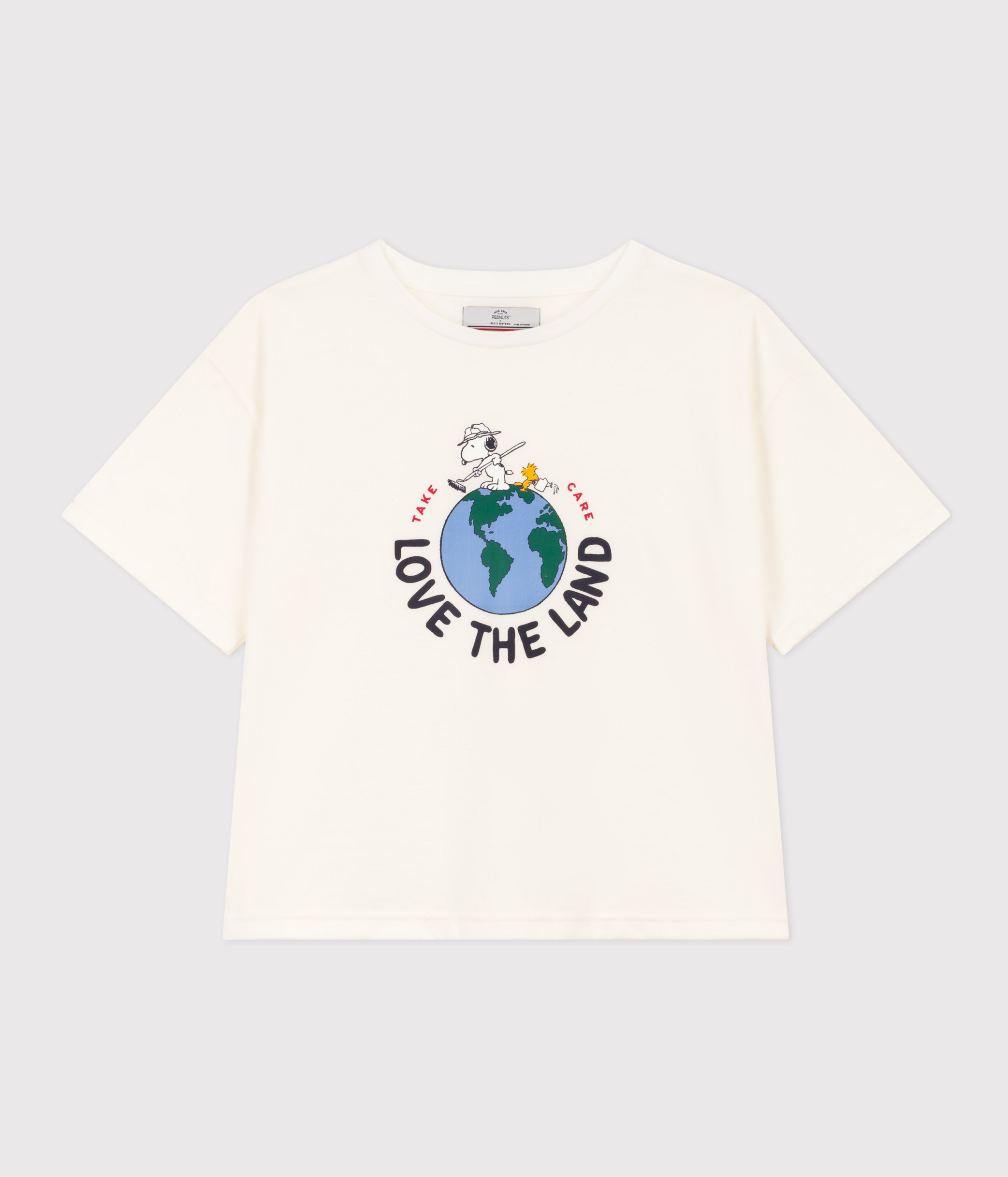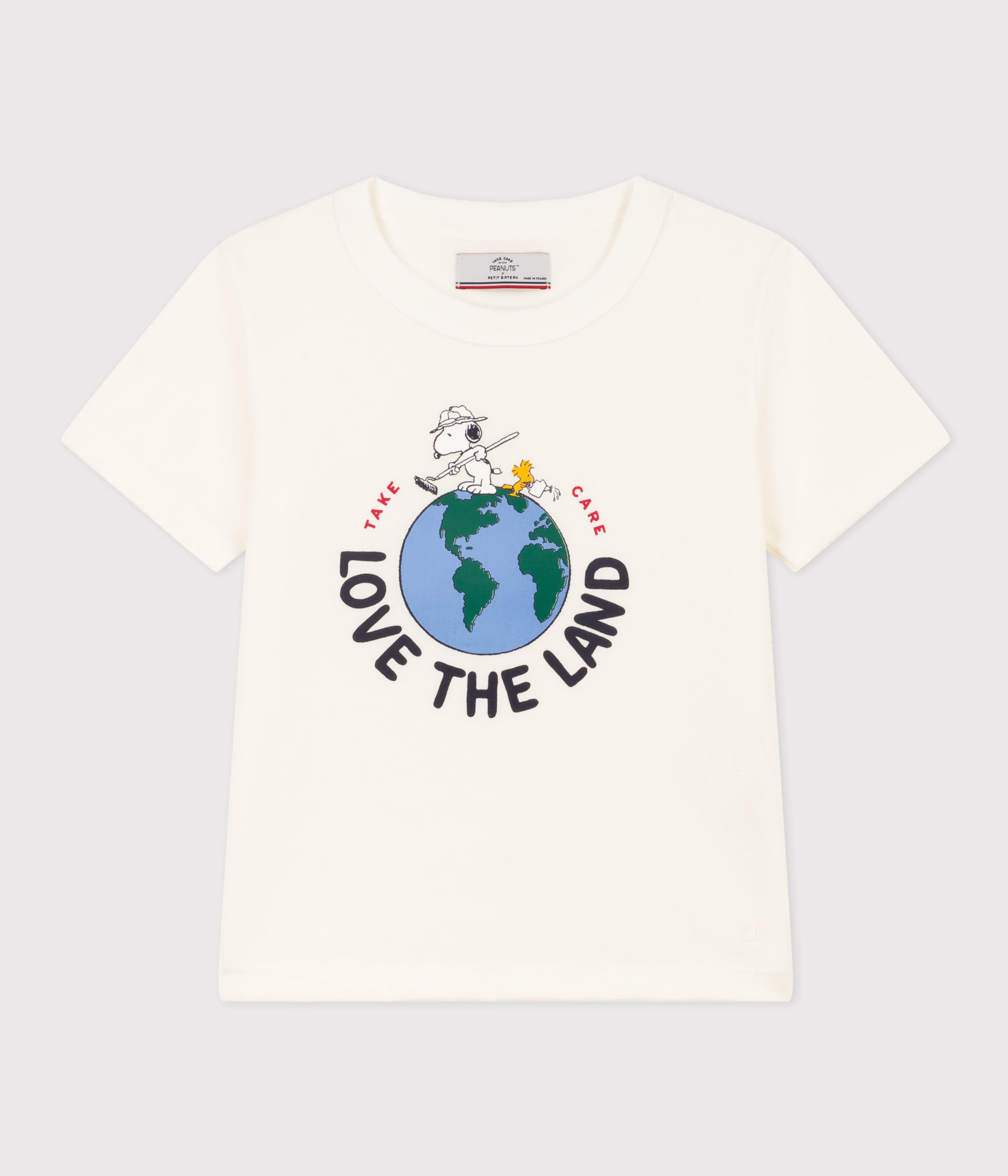 この特別なTシャツには、「TAKE CARE(自分自身や周りの人たち、 そして地球を思いやる)」というプチバトーとピーナッツに共通する思いを込めました。