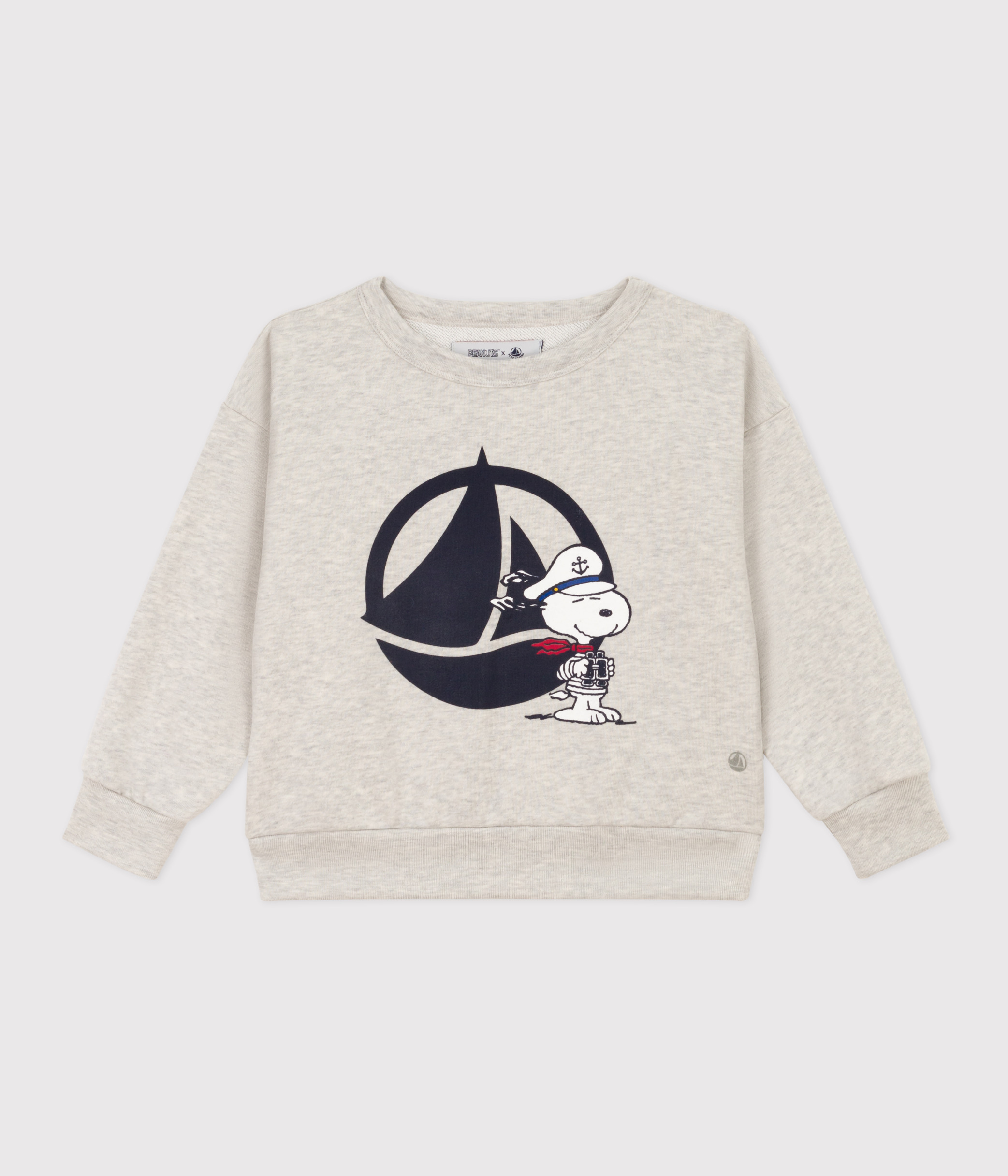 お揃いのスウェットプルオーバーは、前面に大きくプリントされたプチバトーの船とマリニエールを着たスヌーピーが存在感たっぷり。
