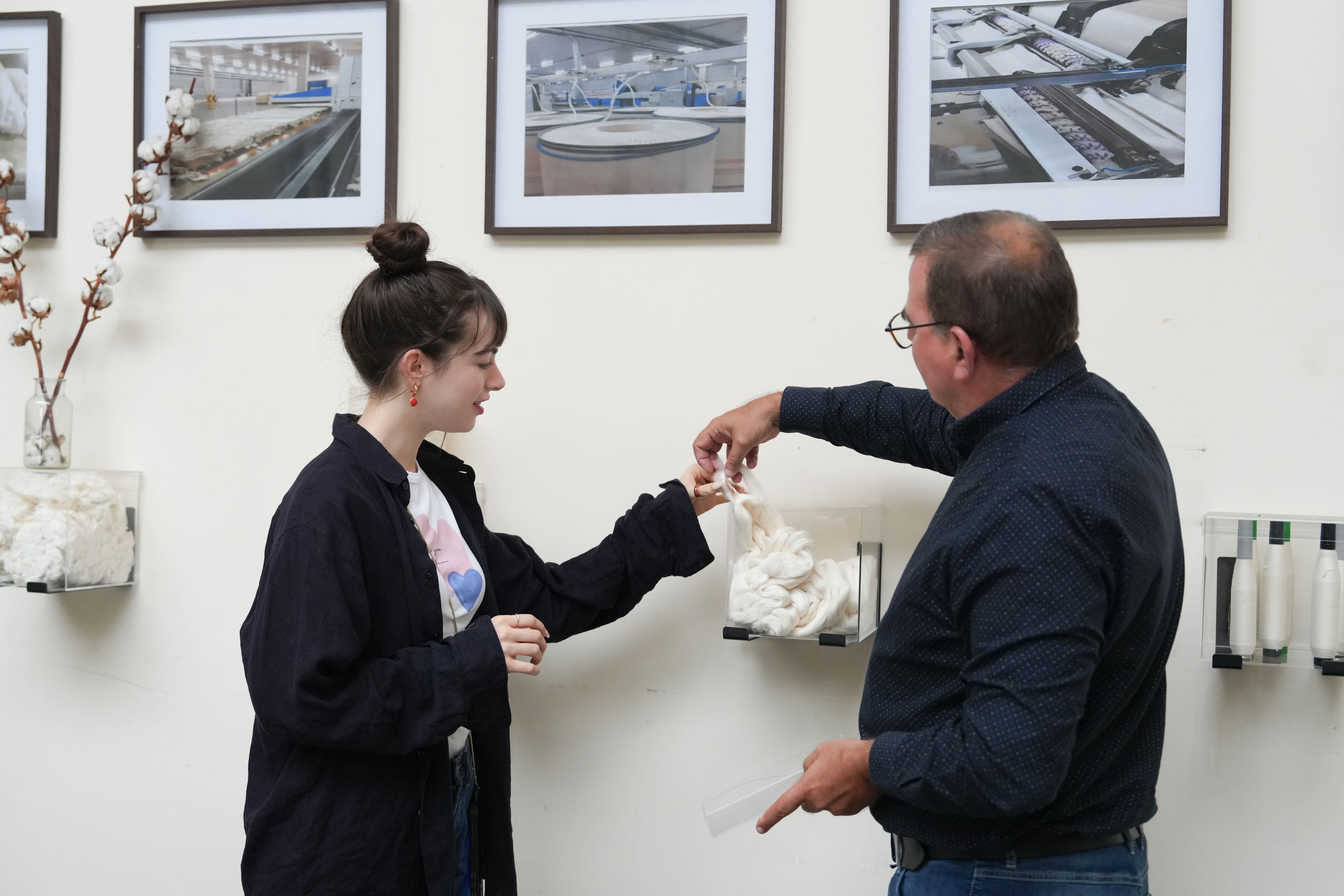 プチバトーの製品づくりは、厳選したオーガニックコットンの選定から始まります。クララさんも品質管理展示を訪れ、その厳しい検品の様子を見学。異物混入や色・風合いのチェックに加え、糸の耐久性も専用機械でしっかり測定しています。