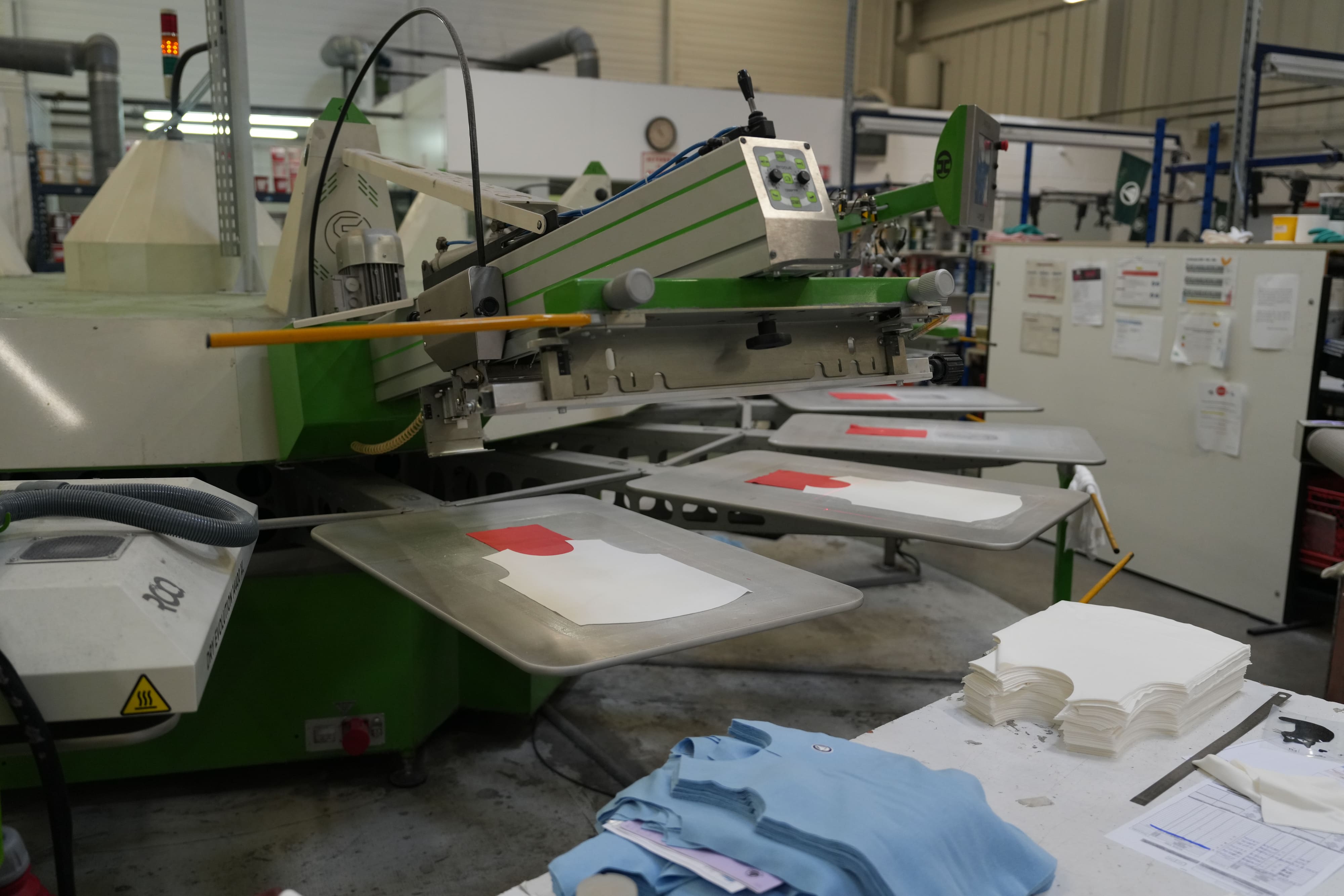 編み上げた生地は、「洗い」「染色」「プリント」の工程へと進みます。2023年に導入された新型染色機により、水の使用量は2019年と比べて30%も削減。しかも使用した水はリサイクルされ、環境への負荷を最小限に抑えています。プリントにはフランス初の最新式デジタルプリント機を使用し、必要な分だけを素早く印刷。従来3〜4ヶ月かかっていた工程が、わずか1週間に短縮されました。繊細な柄は、今も職人の手でシルクスクリーンを用いて丁寧に仕上げられています。